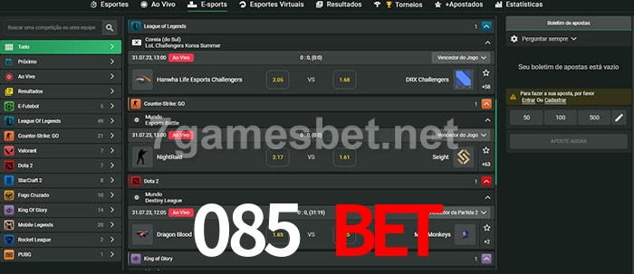 O 085 Bet oferece uma grande seleção de opções de apostas em e-sports com probabilidades competitivas